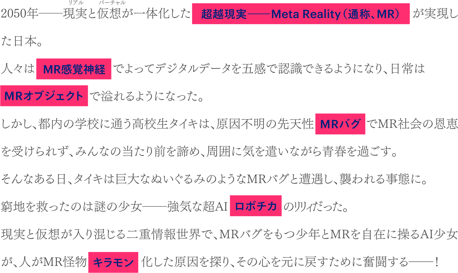 タイキの前に突然現れた超高度AI〈ロボチカ〉の少女。実体はなく完全MR存在。端正な雰囲気だが、口を開くと欲望に忠実で思ったことをそのまま口にする。タイキと〈MRコネクト〉を試みた結果、バグの影響か上位存在として力を失ってしまい、元に戻る方法を探しながらタイキの下に居候している。あんまんが好き。